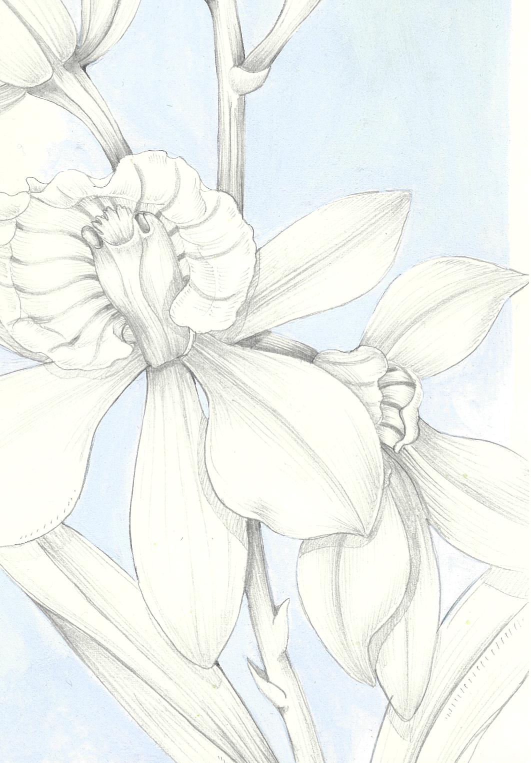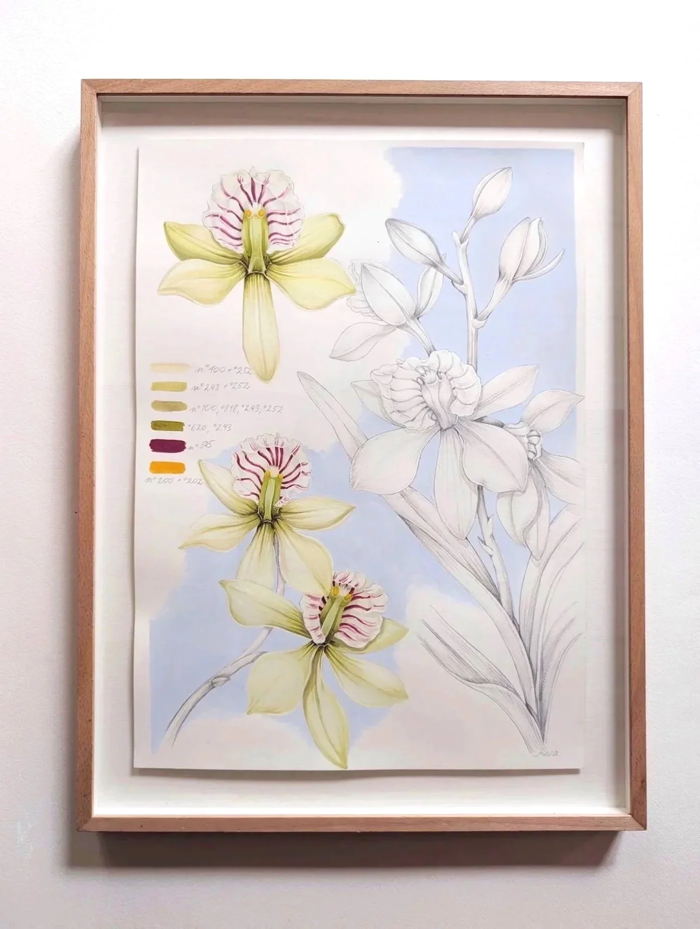 Fully painted elements are combined with graphite studies and soft blue washes. Colour swatches and notes offer insight into my creative process and careful observation of the plant.