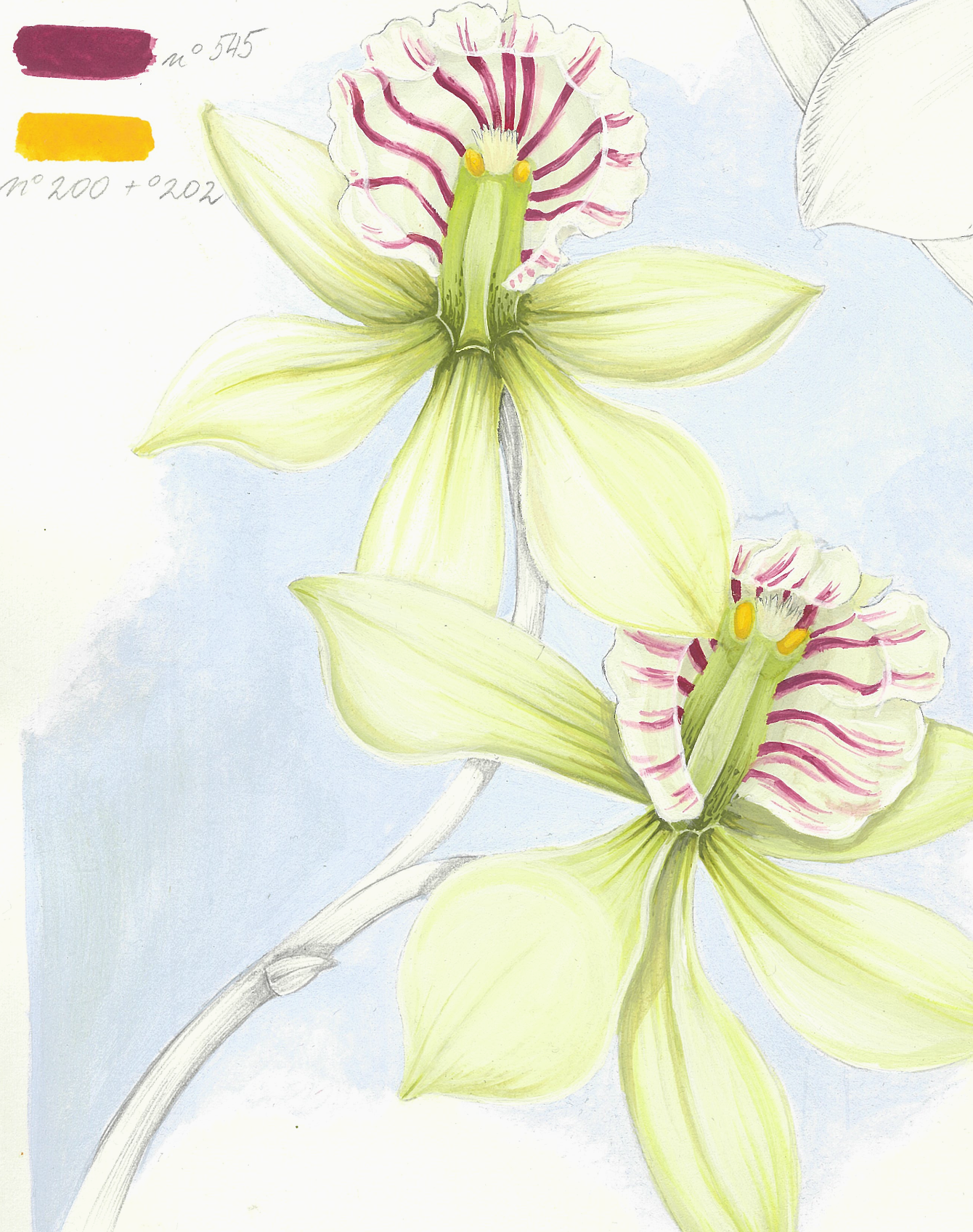 This original botanical illustration depicts Encyclia radiata, presenting the orchid at different stages of its development. Open flowers with pale yellowish green petals and a delicately patterned lip are shown alongside buds and emerging forms, revealing the plant’s structure and rhythm of growth.