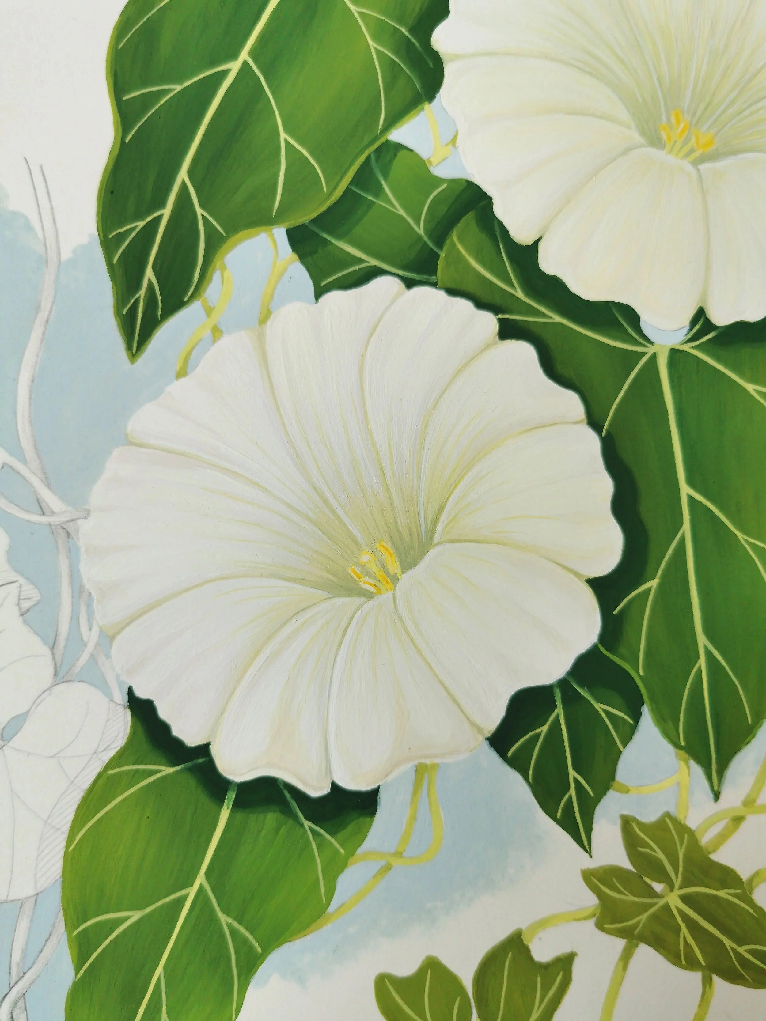 This original botanical illustration depicts the morning glory (Ipomea) in full bloom, its luminous white flowers unfolding against a field of softly layered blue. The composition highlights the plant’s graceful, winding growth, with heart-shaped leaves and slender tendrils interlacing rhythmically.
